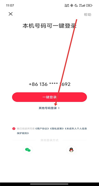 2、在本機號碼可一鍵登錄頁面,點擊其他號碼登錄切換至手機號登錄界面。