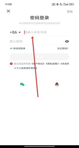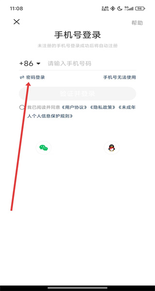 3、在手機號登錄界面,點擊密碼登錄按鈕,可以切換為使用密碼登錄方式。