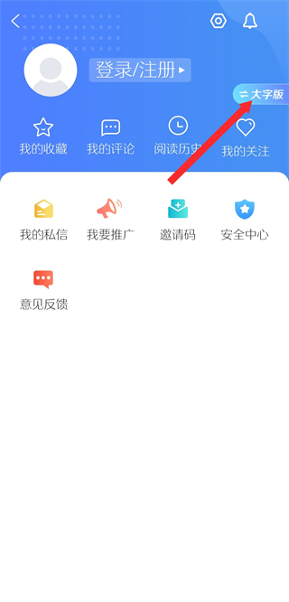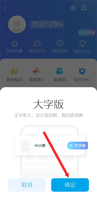 2、在個(gè)人頁(yè)面,找到大字版切換按鈕并點(diǎn)擊,彈出大字版確認(rèn)框。