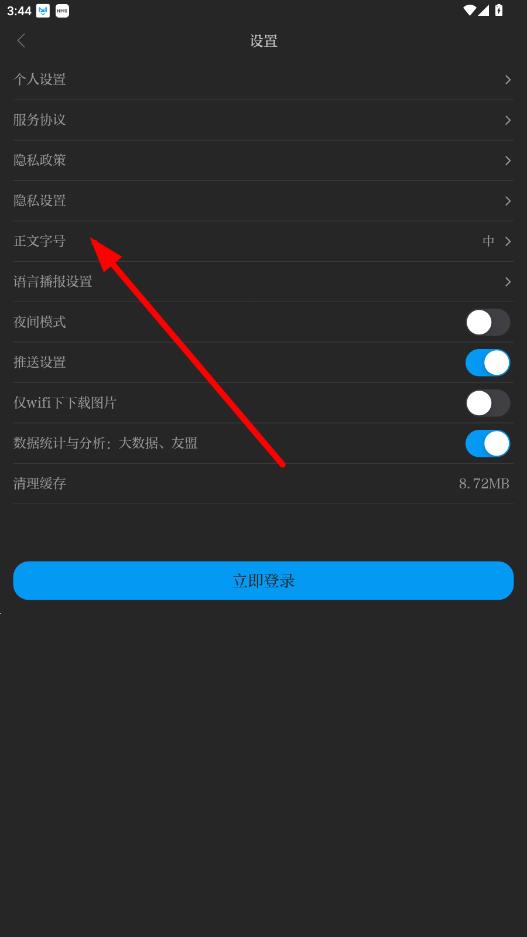 3、在設(shè)置頁面里,點(diǎn)擊正文字號選項(xiàng)。