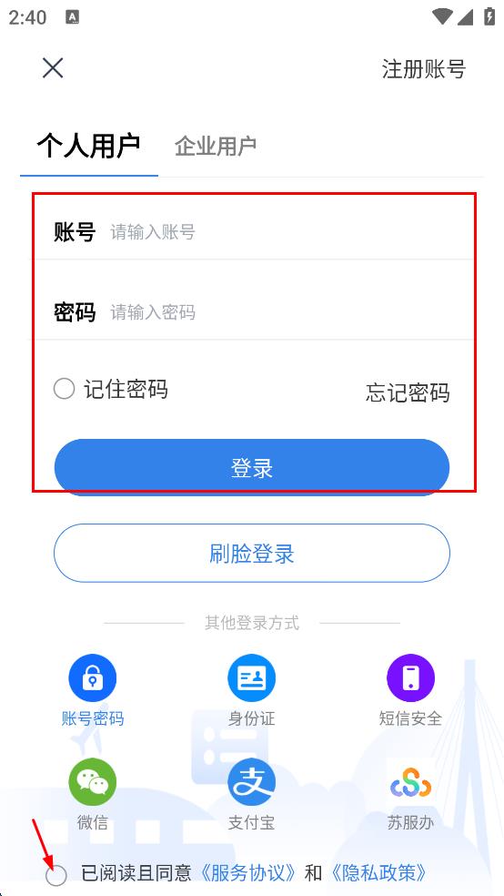 4、在登錄頁面,輸入賬號(hào)和密碼,勾選已閱讀且同意相關(guān)協(xié)議和政策,點(diǎn)擊登錄,即可完成江蘇交通的登錄。