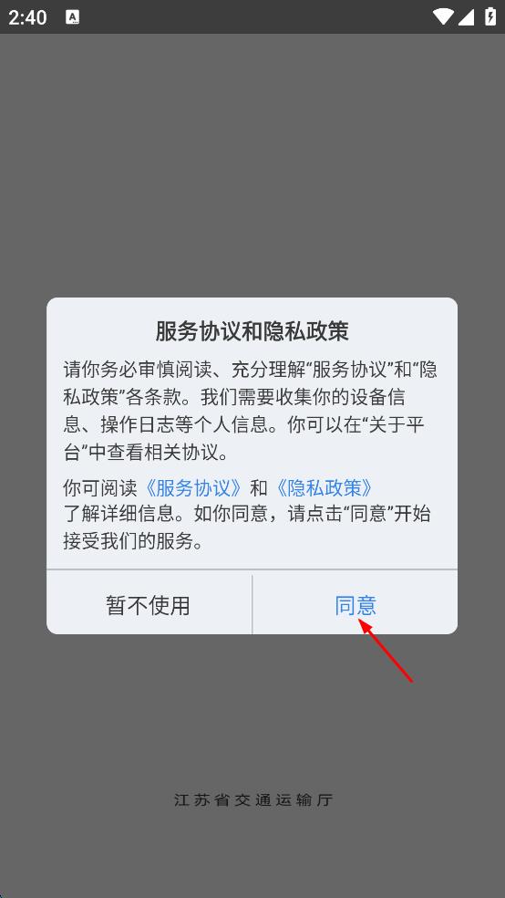 1、打開江蘇交通,在彈出的服務(wù)協(xié)議和隱私政策頁面,點(diǎn)擊同意,進(jìn)入江蘇交通首頁。