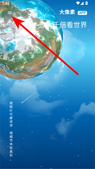 1、打開大像素APP,點(diǎn)擊左上角三條橫線的菜單圖標(biāo),彈出包含登錄入口的側(cè)邊欄。