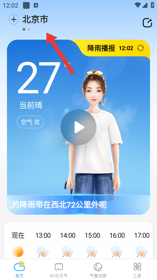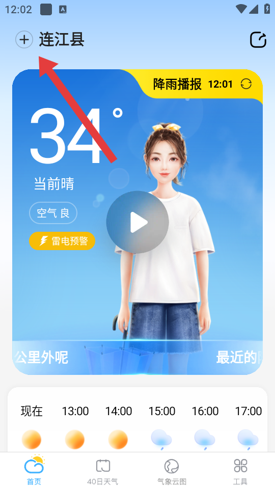 1、在開心天氣主界面,點擊左上角的+號按鈕,進入城市管理頁面。