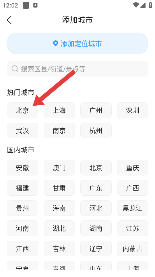 3、在添加城市界面,可通過搜索輸入城市,或直接點擊熱門城市中的目標城市。