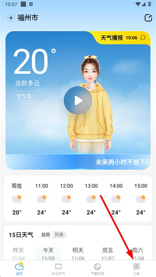 1、打開開心天氣APP,點擊底部工具進入工具頁面。