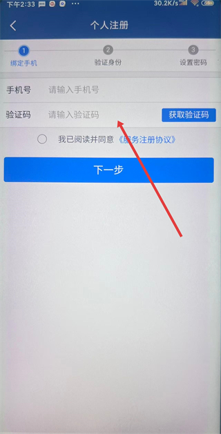 4、在綁定手機步驟,輸入手機號、獲取并填寫驗證碼,勾選協(xié)議后點擊下一步,后續(xù)完成身份驗證、設(shè)置密碼即可完成注冊。