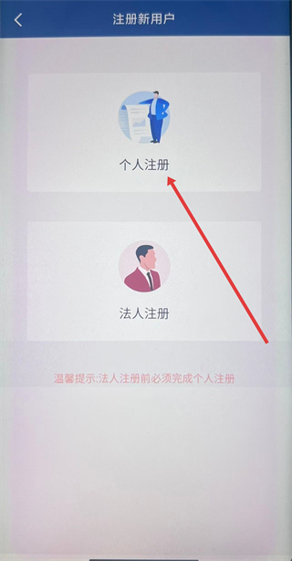 3、在注冊新用戶頁面,選擇個人注冊,若為企業(yè)用戶可選擇法人注冊。
