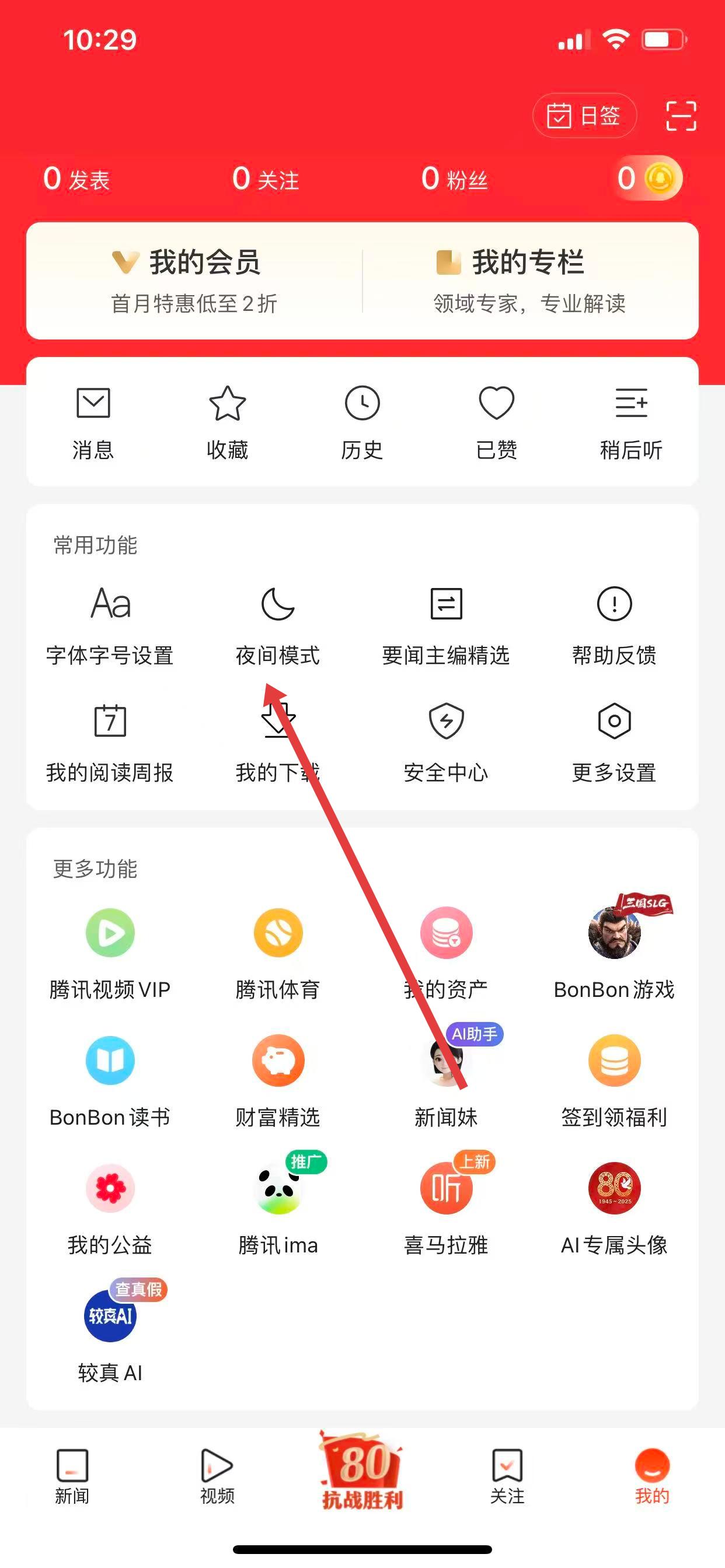 2、在個(gè)人頁(yè)面的常用功能板塊中,點(diǎn)擊夜間模式圖標(biāo)。