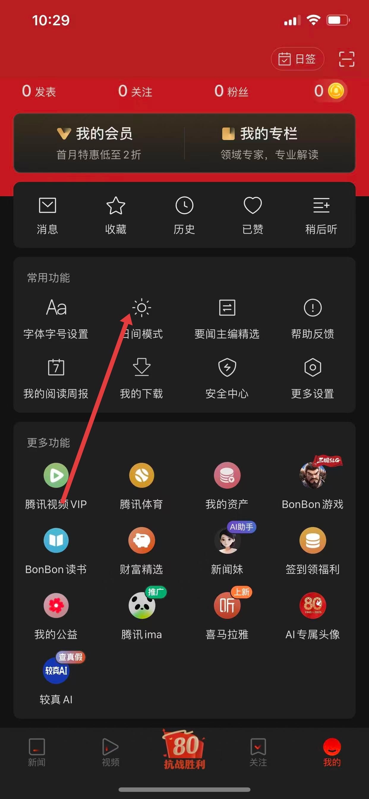 3、點(diǎn)擊后APP界面會(huì)切換為夜間模式,夜間模式圖標(biāo)會(huì)變?yōu)槿臻g模式,點(diǎn)擊日間模式圖標(biāo)可切換回正常模式。