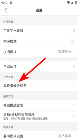 3、在設(shè)置的頁(yè)面,點(diǎn)擊早晚報(bào)音色設(shè)置,進(jìn)入音色切換的界面。