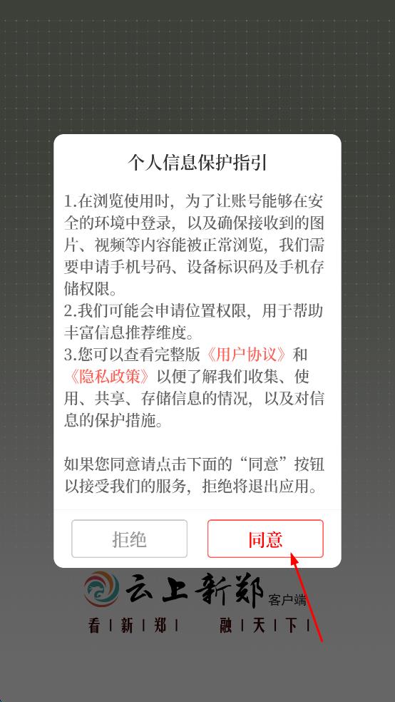 1、打開(kāi)云上新鄭,在彈出的個(gè)人信息保護(hù)指引頁(yè)面,點(diǎn)擊同意,進(jìn)入云上新鄭首頁(yè)。