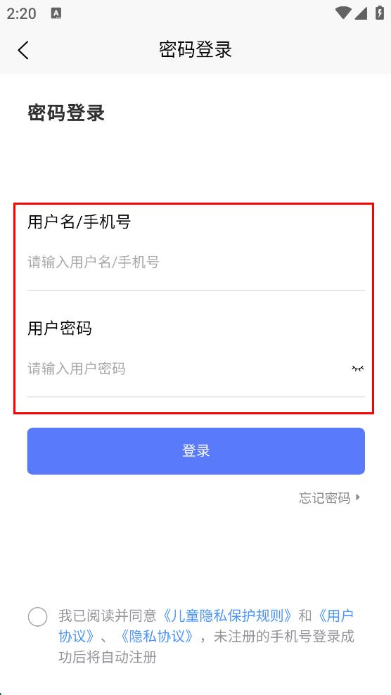 3、在密碼登錄界面,輸入用戶名/手機(jī)號和用戶密碼。