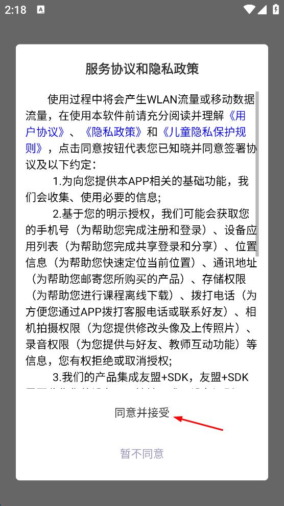 1、打開新華智慧校園App,在服務(wù)協(xié)議和隱私政策頁面,點(diǎn)擊“同意并接受”按鈕。