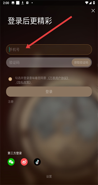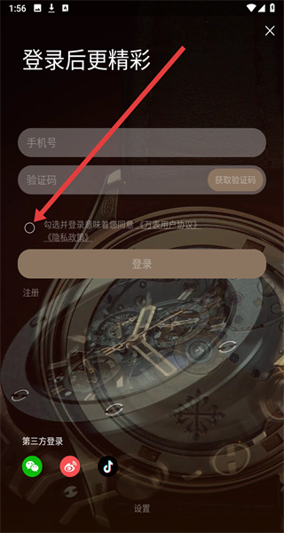 3、在勾選好同意按鈕后,點擊上方輸入框填寫手機號,以便獲取驗證碼進行登錄。