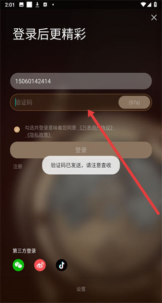 4、在發(fā)送驗證碼后,可在輸入框填寫驗證碼,隨后點擊登錄按鈕完成登錄。