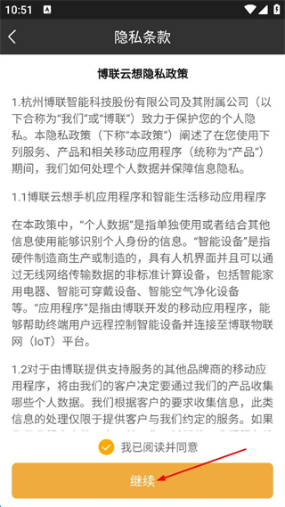 2、在隱私條款頁面,勾選我已閱讀并同意,點擊繼續(xù)。