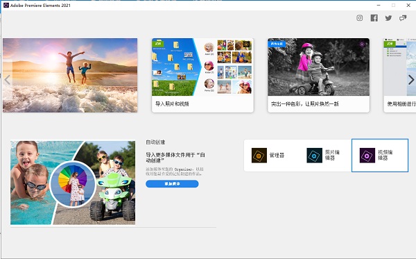 5、接下來在出現(xiàn)的頁面中選擇視頻編輯器即可進(jìn)入Premiere Elements2021,所有功能免費(fèi)使用