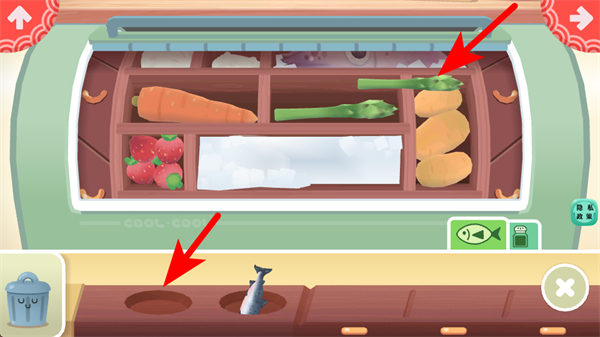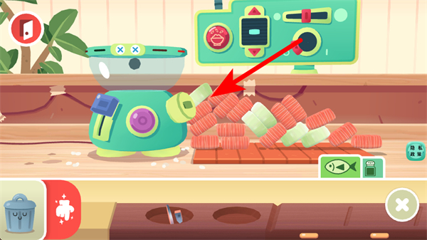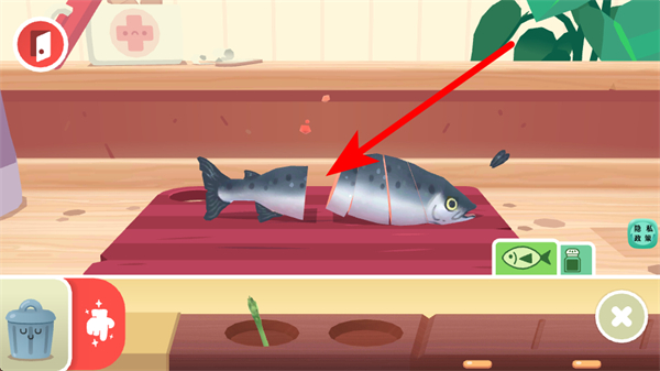 3、處理食材時(shí),我們需要將魚(yú)放置在砧板上進(jìn)行切割,按照提示完成魚(yú)肉的分割,得到制作壽司的魚(yú)肉原料。