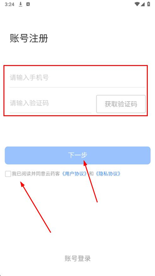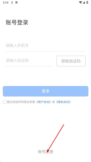 1、打開云藥客APP,在賬號登錄頁面點擊賬號注冊。