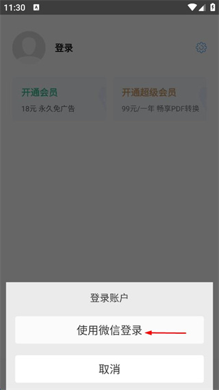 2、在登錄選項中選擇使用微信登錄,完成登錄操作。