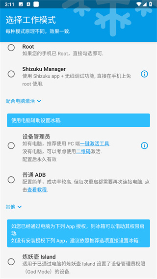 之后打開冰箱,選擇 Shizuku 模式即可使用。如果重啟手機,需要重新激活 Shizuku.