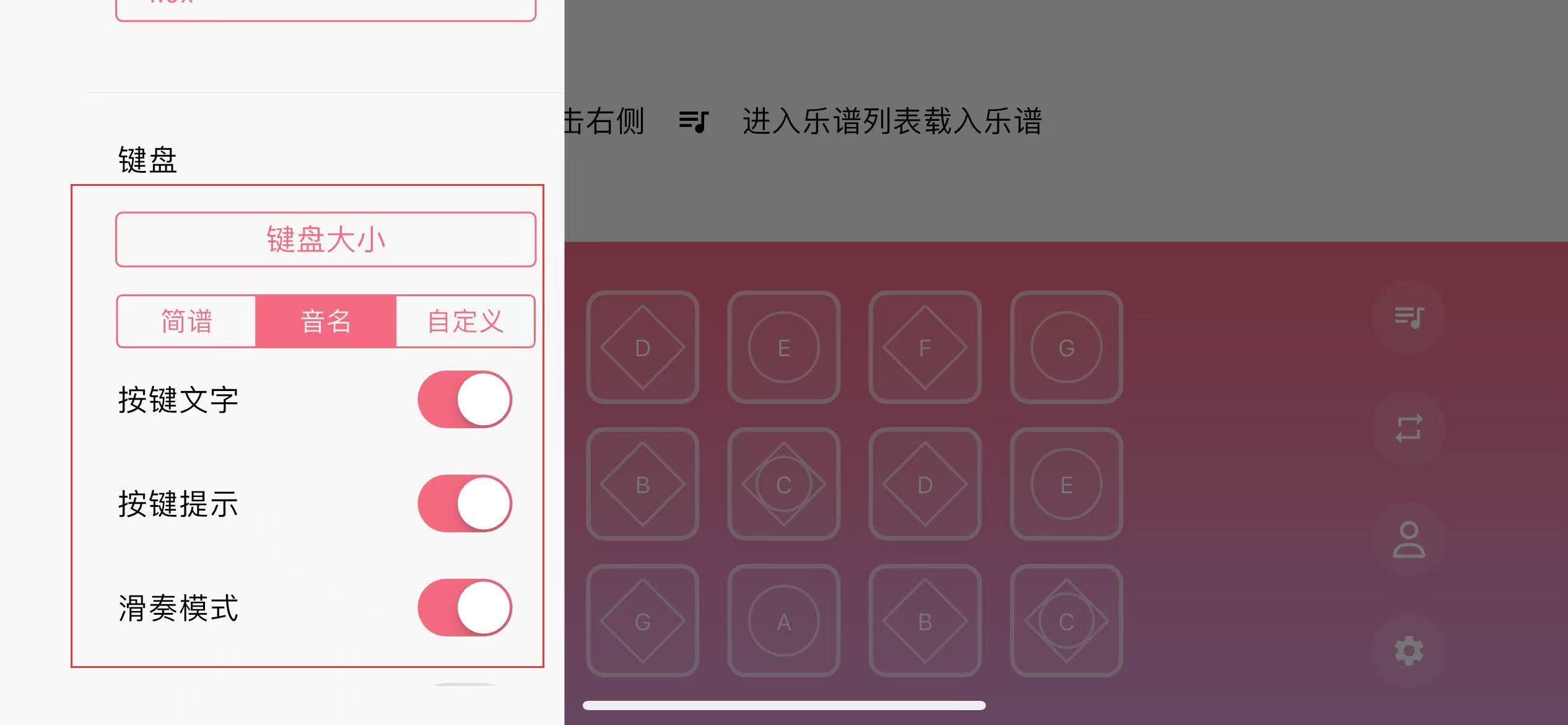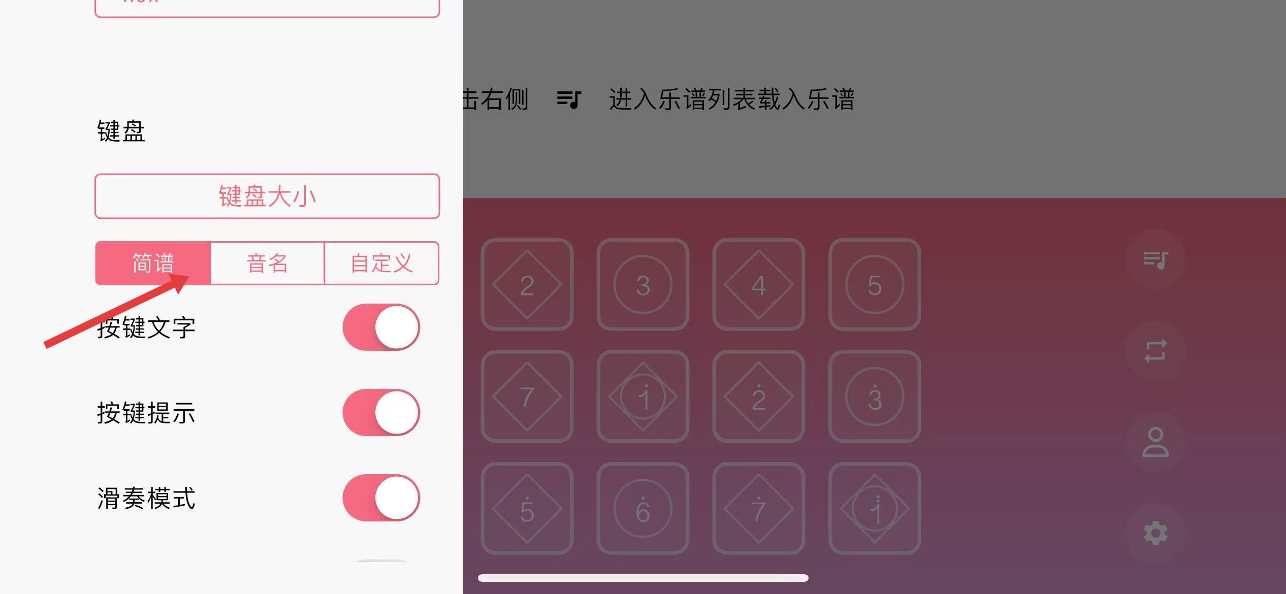 3、點擊鍵盤設(shè)置區(qū)域中的簡譜、音名、自定義選項。