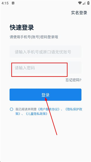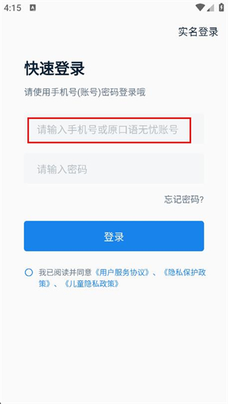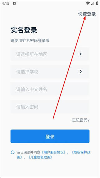 1、打開(kāi)口語(yǔ)無(wú)憂app,在登錄頁(yè)面點(diǎn)擊右上角的快速登錄。