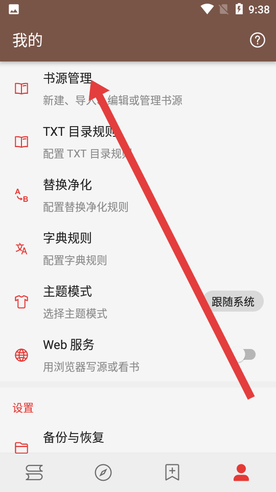 1、打開閱讀APP,點(diǎn)擊右下角圖標(biāo),進(jìn)入我的頁面,點(diǎn)擊書源管理選項(xiàng),進(jìn)入書源管理界面。