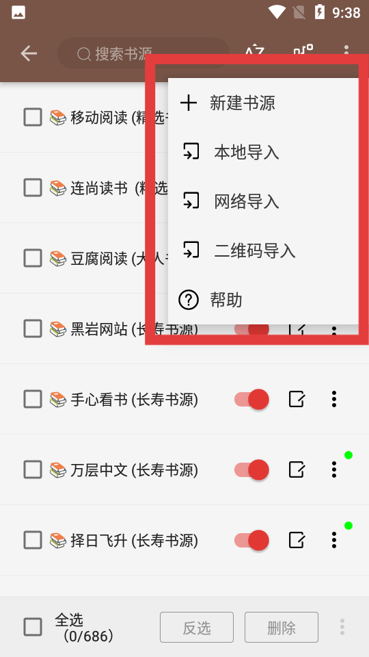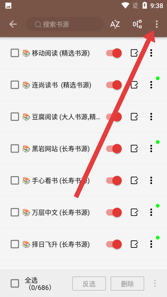 2、進(jìn)入書源管理界面后,找到右上角的三點(diǎn)圖標(biāo)并點(diǎn)擊,彈出下一步的操作菜單。