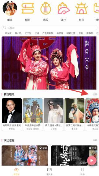 1、啟動粵劇迷App,在首頁找到精選唱段區(qū)域,點擊其右側(cè)的全部按鈕,進入完整的唱段列表頁面。