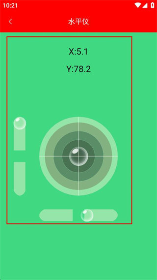 3、返回主界面點(diǎn)擊水平儀圖標(biāo),觀察X、Y數(shù)值和氣泡位置判斷設(shè)備水平。