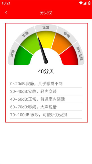 2、點(diǎn)擊分貝儀圖標(biāo),進(jìn)入界面查看當(dāng)前環(huán)境分貝數(shù)值及聲音狀態(tài)說明。