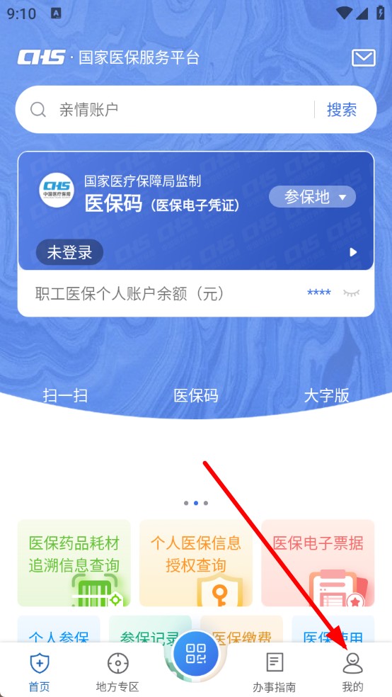1、打開(kāi)國(guó)家醫(yī)保服務(wù)平臺(tái)APP,點(diǎn)擊頁(yè)面底部導(dǎo)航欄最右側(cè)的「我的」,進(jìn)入個(gè)人中心界面。