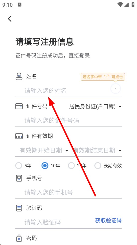 3、在注冊(cè)頁(yè)依次填寫(xiě)姓名、居民身份證號(hào)碼、證件有效期、手機(jī)號(hào),獲取并輸入驗(yàn)證碼,設(shè)置登錄密碼,完成信息提交。