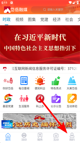1、在岱岳融媒的首頁(yè),點(diǎn)擊底部我的按鈕,進(jìn)入個(gè)人的頁(yè)面。