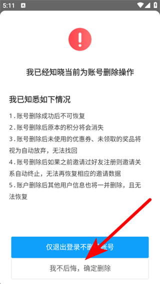 4、在確認(rèn)的頁(yè)面,點(diǎn)擊我不后悔,確定刪除,完成賬號(hào)注銷操作。