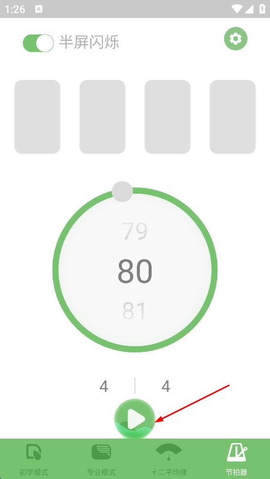 4、在節(jié)拍器設置頁面,能看到半屏閃爍開關以及節(jié)拍數值等,點擊播放按鈕,即可使用節(jié)拍器功能。