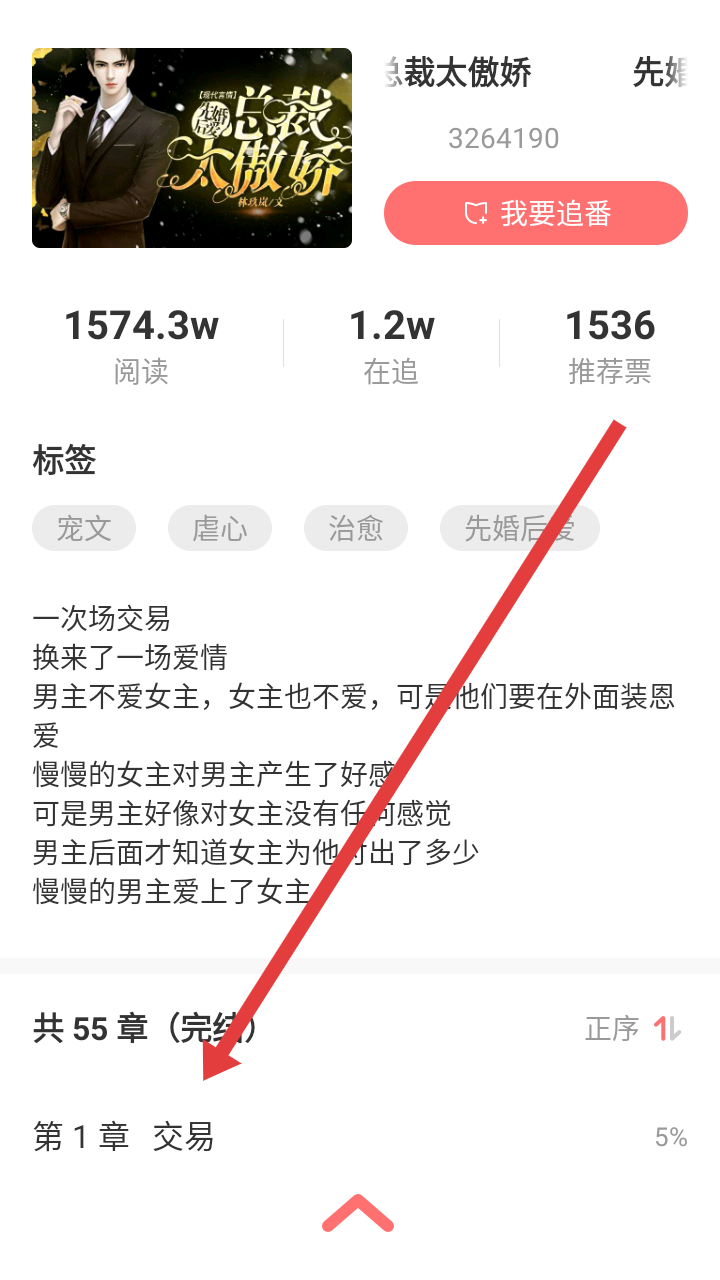 2、點(diǎn)擊選中的小說(shuō)進(jìn)入詳情頁(yè),找到并點(diǎn)擊小說(shuō)章節(jié),比如第1章 交易。