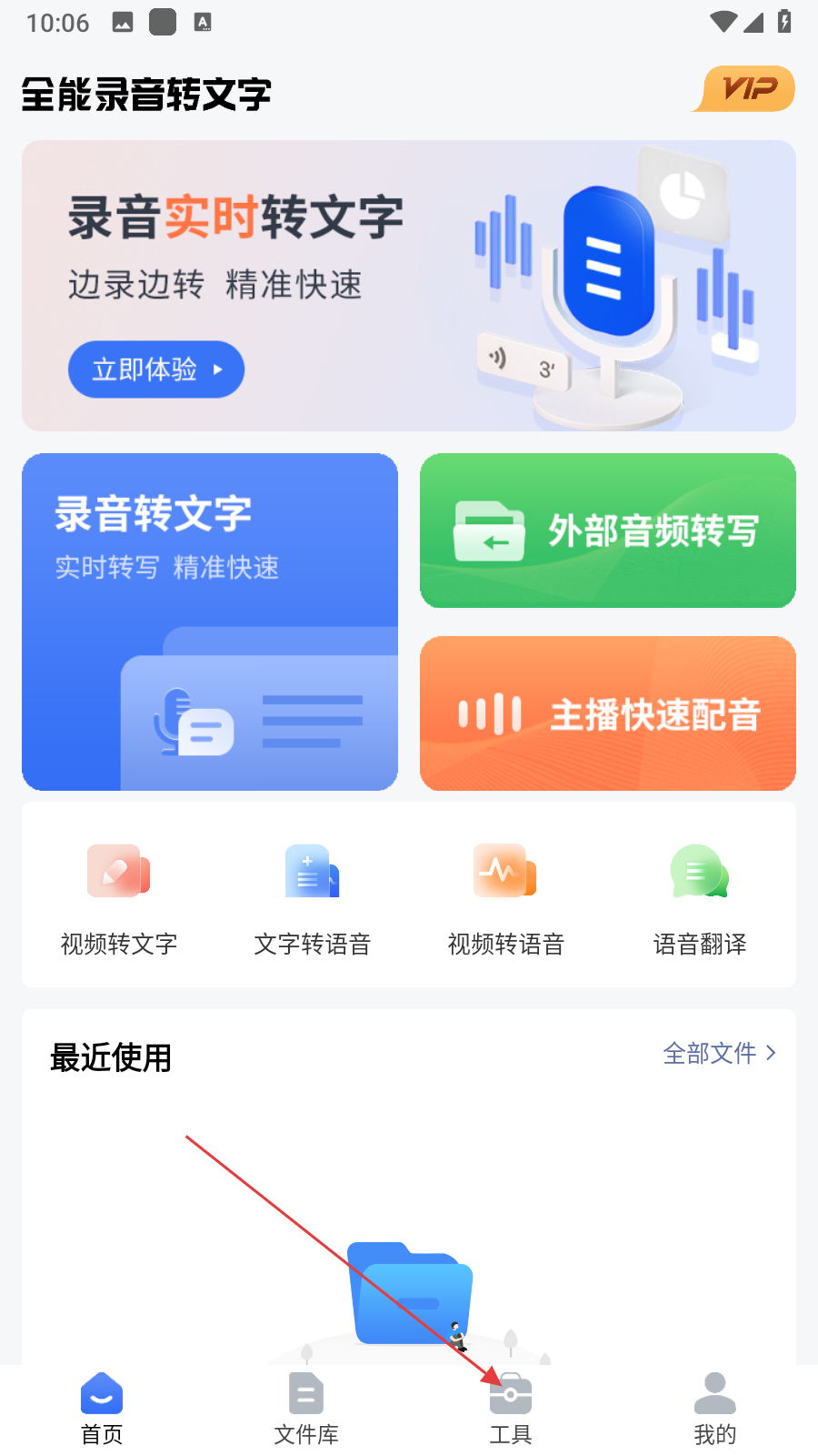 1、打開全能錄音轉(zhuǎn)文字APP,點(diǎn)擊底部導(dǎo)航欄中的工具選項(xiàng),進(jìn)入工具頁面。
