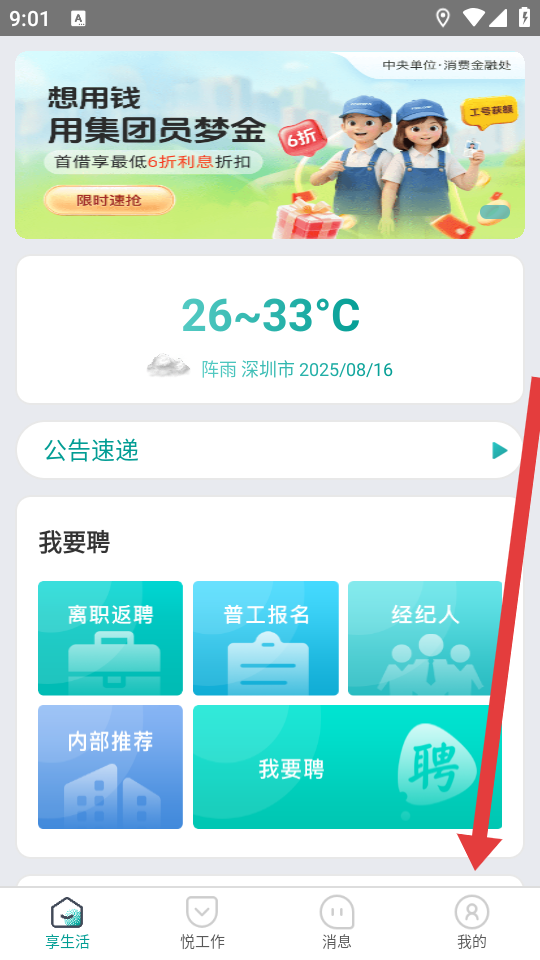 1、在富士康愛(ài)口袋app應(yīng)用的首頁(yè)底部,需要最右側(cè)點(diǎn)擊我的,進(jìn)入個(gè)人功能相關(guān)的界面。