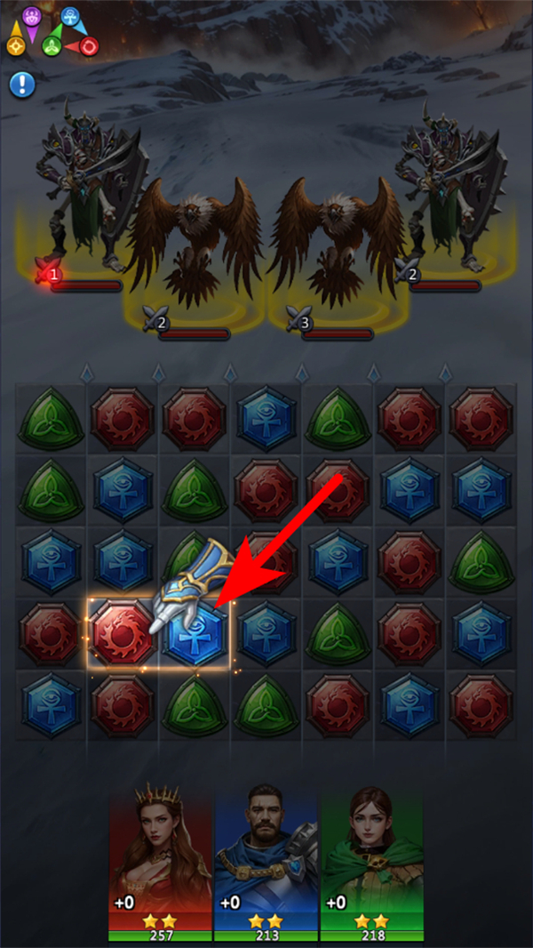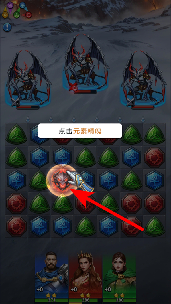 1、進入游戲后,按照提示交換元素寶石,通過交換相同元素的寶石形成消除組合,進而對敵人造成傷害,推動戰(zhàn)斗進程。