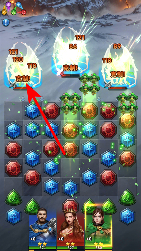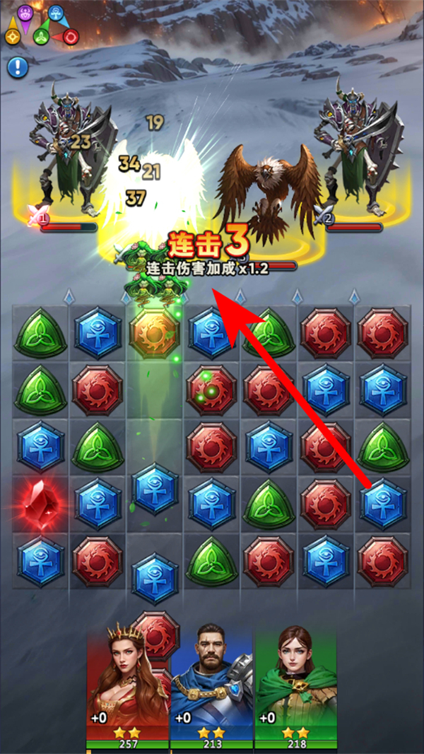 2、消除寶石時盡量形成連擊如連擊3,連擊會帶來傷害加成,提升對敵人的打擊效果,同時還能觸發(fā)特殊消除效果,助力快速通關(guān)。