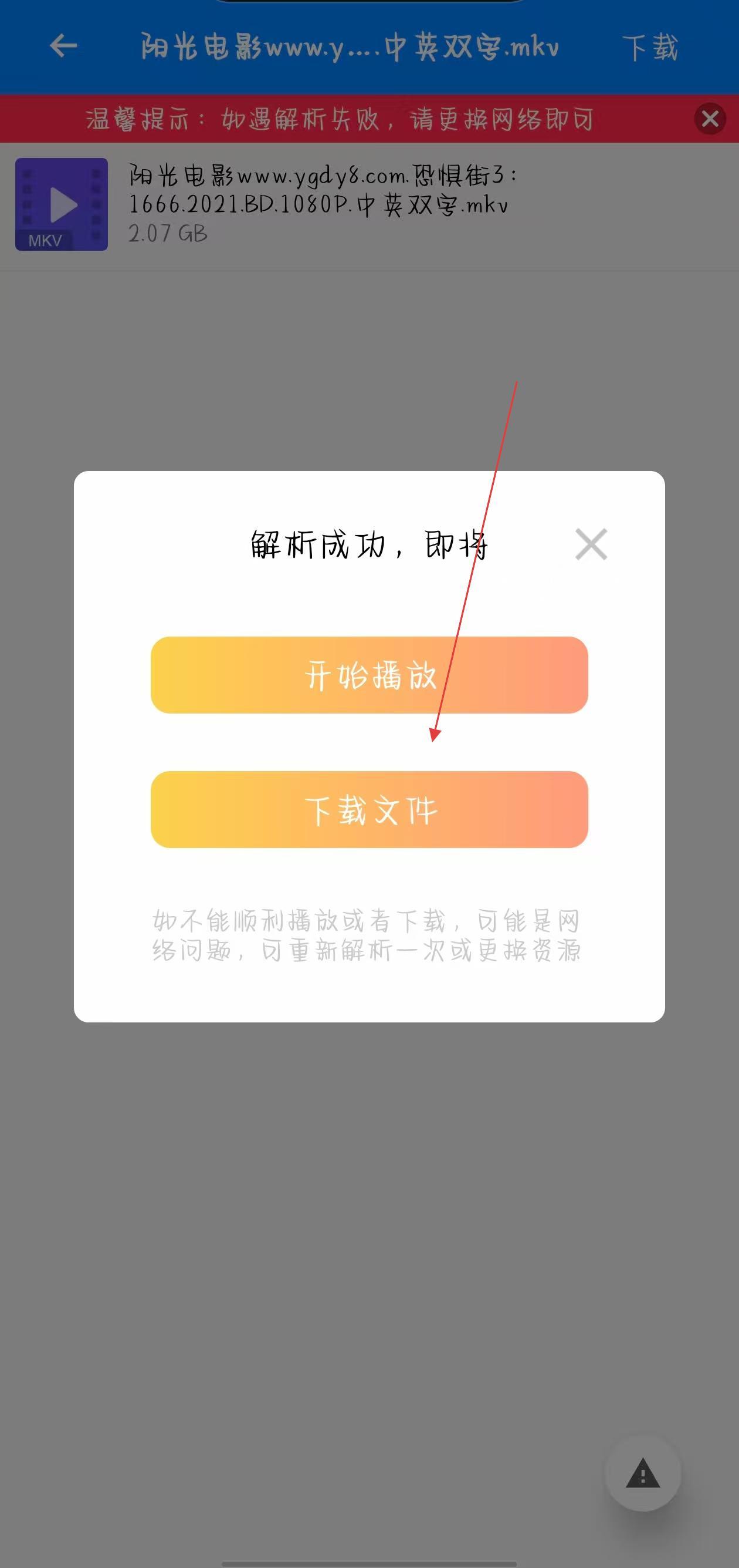 3、解析完成后,會彈出解析成功,即將的提示彈窗,在彈窗中點(diǎn)擊下載文件按鈕。