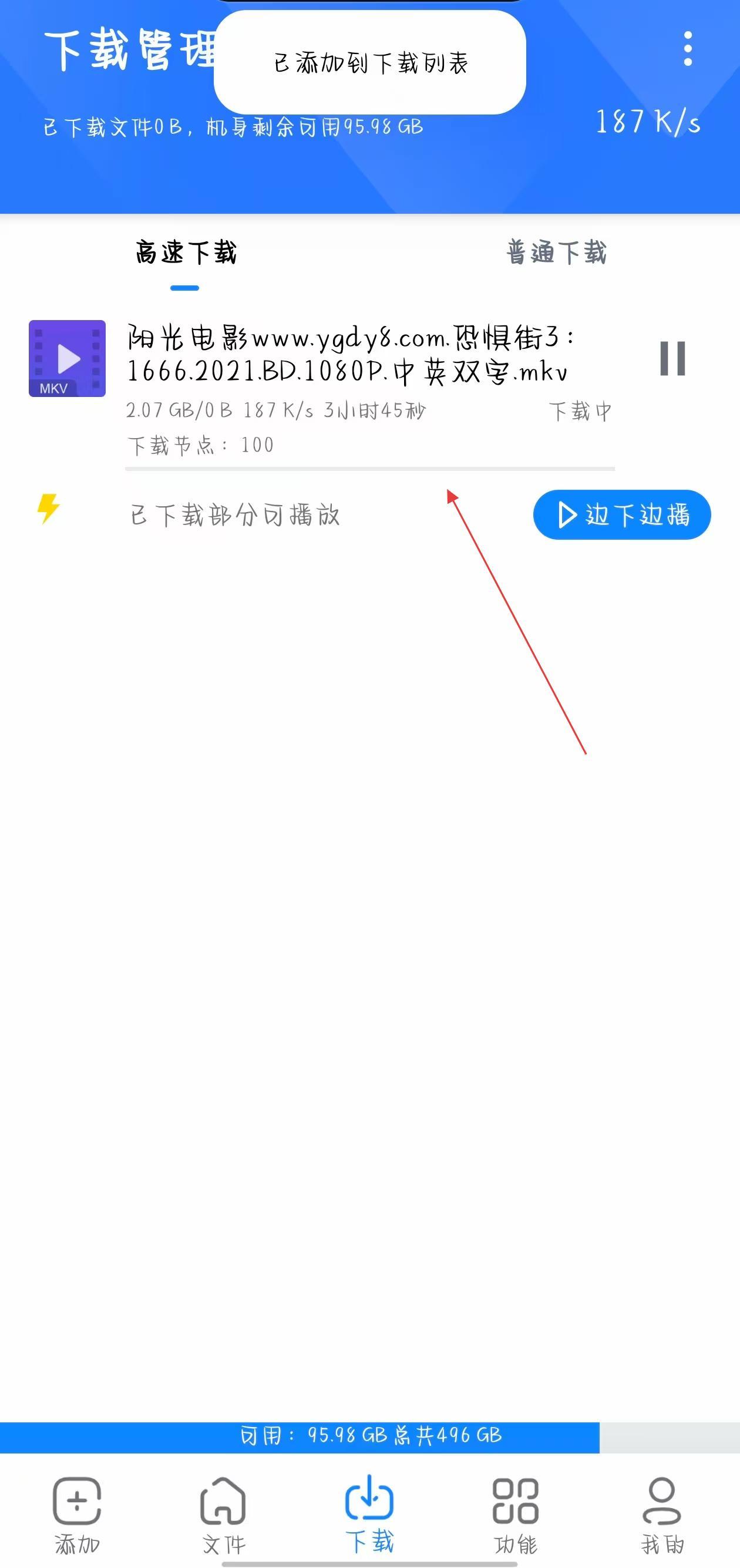 4、點(diǎn)擊下載文件后,文件會被添加到下載列表,進(jìn)入下載頁面可查看文件的下載進(jìn)度。