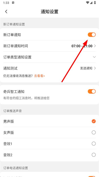 4、在通知設(shè)置頁面找到新訂單通知開關(guān),將其關(guān)閉,即可關(guān)閉接單提示音。