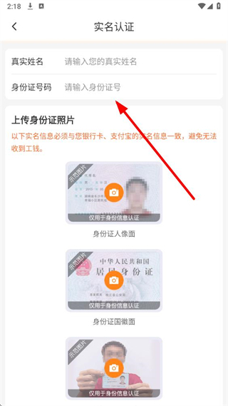3、在實(shí)名認(rèn)證頁面,輸入真實(shí)姓名、身份證號碼,上傳身份證人像面、國徽面及手持身份證照片,完成提交即可。