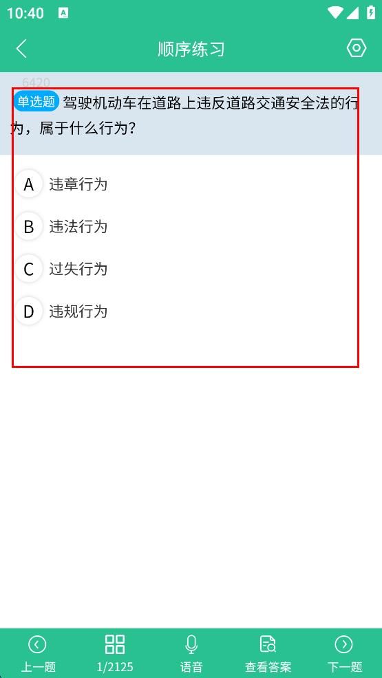 4、在順序練習(xí)頁(yè)面,可看到科目一題目,按順序進(jìn)行練習(xí),也可使用下方功能按鈕輔助練習(xí)。
