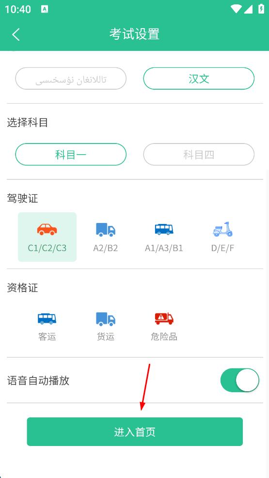 2、進(jìn)入考試設(shè)置頁(yè)面,設(shè)置好相關(guān)選項(xiàng)后,點(diǎn)擊進(jìn)入首頁(yè)按鈕。