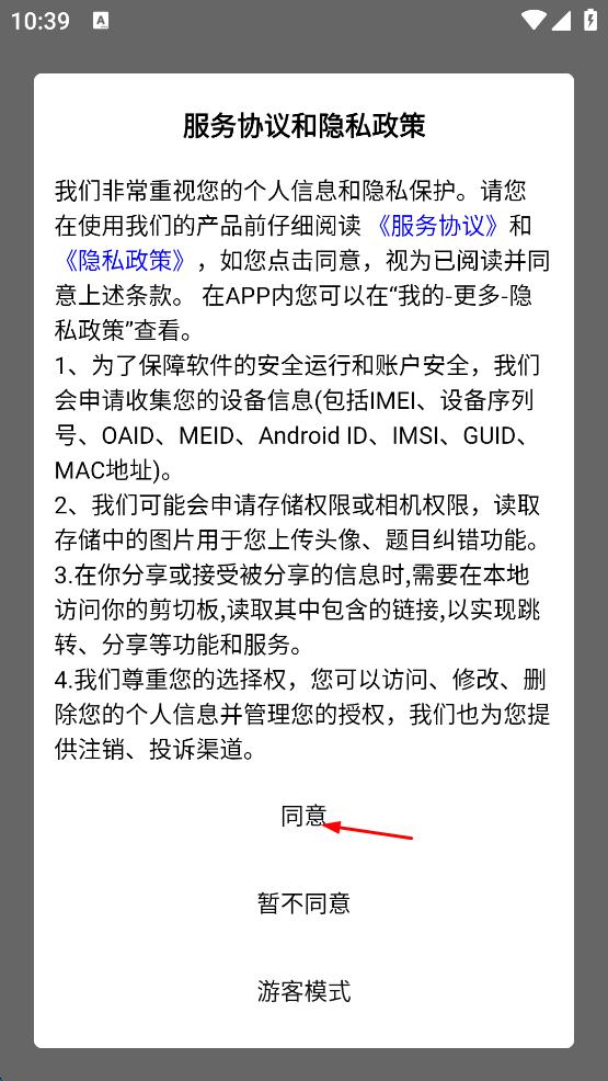 1、打開(kāi),出現(xiàn)服務(wù)協(xié)議和隱私政策彈窗,閱讀后點(diǎn)擊同意按鈕。